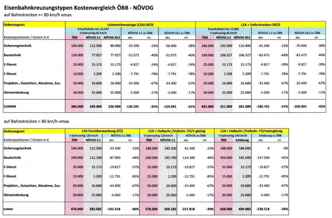 Der Niederösterreichische Verkehrslandesrat Mag. Karl Wilfing führt seit fast zwei Jahren Gespräche mit dem BMVIT und den ÖBB, um mehr Kostenwahrheit bei der Errichtung von Eisenbahnkreuzungen zu erreichen. Im Bestreben die Kostenstrukturen und die finanziellen Aufwände besser zu verstehen, wurden gemeinsam mit den ÖBB "Standardtypen" von Bahnübergängen festgelegt. Für die jeweiligen Eisenbahnkreuzungstypen wurden dann die Kosten seitens der ÖBB dargestellt. Anschließend hat man die landeseigene NÖVOG herangezogen, um unter denselben Bedingungen nachzurechnen, was die Errichtung der ausgewählten Bahnkreuzungen in ihrem Auftrag kosten würde (siehe Beilage).