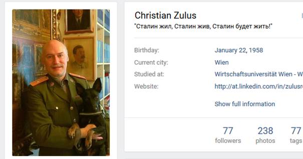 Der dritte Administrator ist Mag. Christian Zulus aus Wien, der sich als „Herr Gefreiter“ bezeichnet und auf vk.com auch mit einer persönlichen Seite[2] präsent ist, die ihn auf einem Titelbild mit Stalin im Hintergrund zeigt. Als Motto hat er sich folgenden Spruch in russischer Sprache gegeben: „Es lebe Stalin, Stalin wird leben“.
