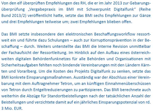 In der Follow-up-Überprüfung des Rechnungshofes Reihe Bund 2017/19 zu der bereits vorangegangenen Gebarungsüberprüfung „Vergabepraxis im BMI mit Schwerpunkt Digitalfunk“ hielt der Rechnungshof folgendes fest: