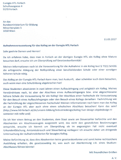 betreffend rechtswidrige Aufnahme von Studenten am Kolleg der Euregio HTL Ferlach