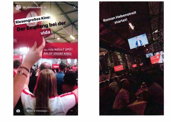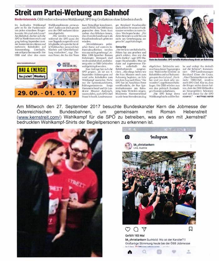 Die oben stehen Bilder stammen vom Instagram Account des Bundeskanzlers und belegen eindeutig SPÖ Wahlwerbung in ÖBB Räumlichkeiten (,,vida wählt SPÖ“, „Das ist unsere Wahl! 15. Oktober SPÖ“).