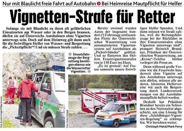 Anfang August 2017 erschien in der Kronen-Zeitung ein Artikel, wonach Mitarbeiter bzw. freiwillige Helfer von Wasser- und Bergrettung bei Einsätzen Strafe zahlen müssen, wenn sie auf der Autobahn ohne Vignette geblitzt werden.