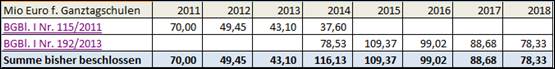Das bedeutet, dass bereits folgende Finanzmittel seitens des Bundes für den Ausbau der schulischen Tagesbetreuung beschlossen wurden: