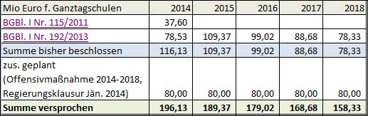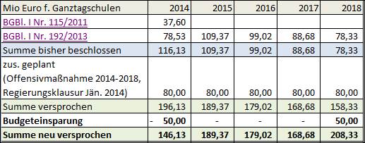 Nach der Regierungsklausur im Jänner 2014 wurde verlautbart, dass im Zuge von Offensivmaßnahmen zusätzlich 400 Mio. Euro in den Jahren 2014-18, also 80 Mio./Jahr, in den Ausbau der schulischen Tagesbetreuung investiert werden. Das würde bedeuten, dass mit dem bereits beschlossenen Budget folgende Gelder dafür künftig zur Verfügung stehen müssten: