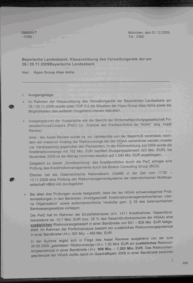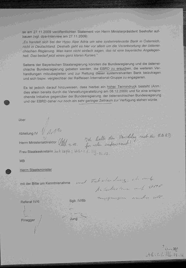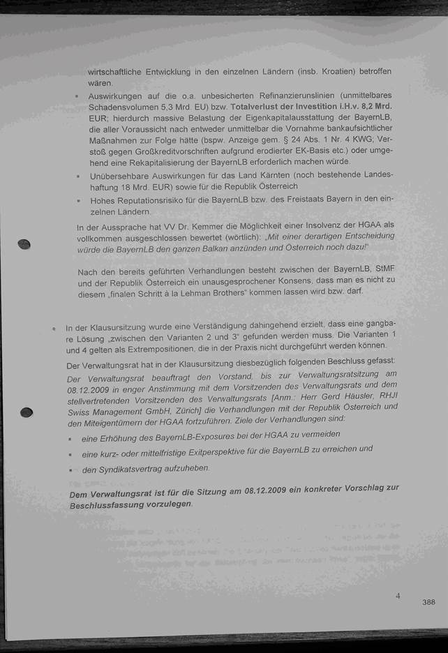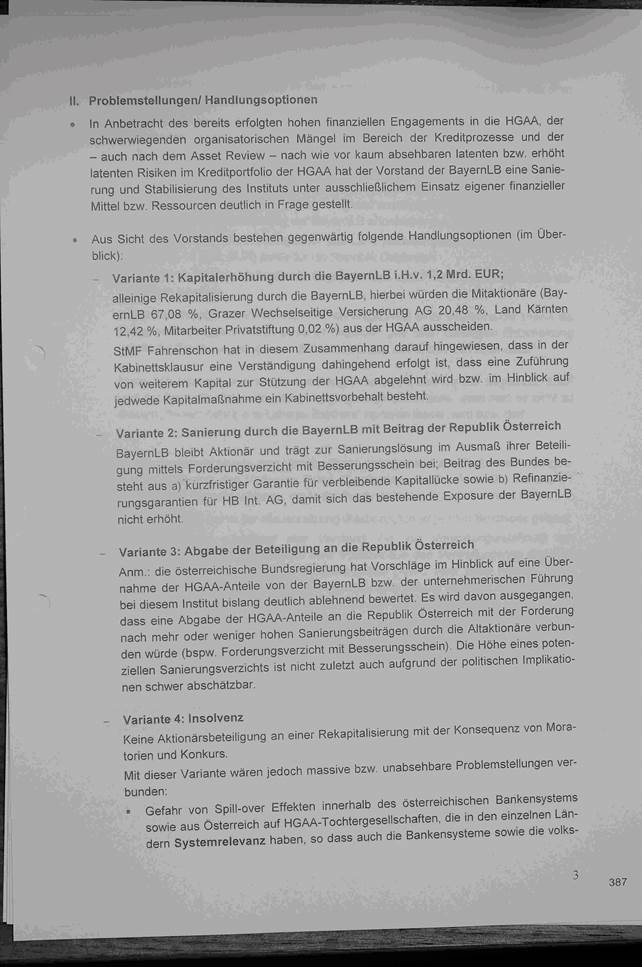 Aufgrund des nachfolgend angeführten Dokuments vom 01.12.2009 zur Verwaltungsratsklausur der BayernLB vom 28. und 29.11.2009 ist ersichtlich, dass die sogenannte Notverstaatlichung NICHT „alternativlos“ gewesen sei, wie dies immer von den Proponenten der Republik Österreich behauptet wurde. Vielmehr standen einige Varianten zur Diskussion. Aufgrund des hier veröffentlichten Dokuments stellen sich im Anschluss unten zitierte Fragen.