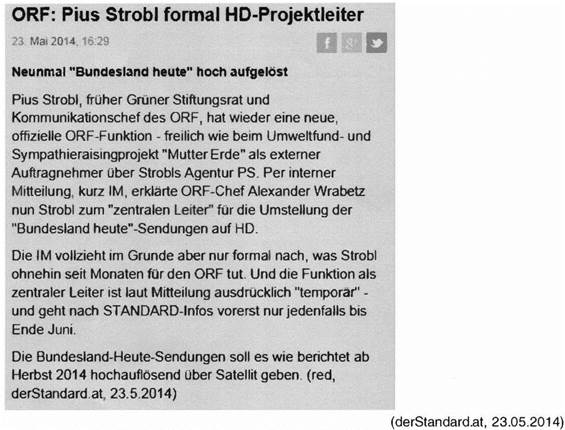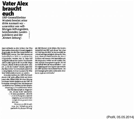 5. Das Magazin „Profil“ schreibt in seinem Artikel vom 05.05.2014: ,,(... ) Nebenbei bedient der ORF-Chef dank „Mutter Erde“ grüne-affine NGOs wie Greenpeace oder Global 2000. (...) “