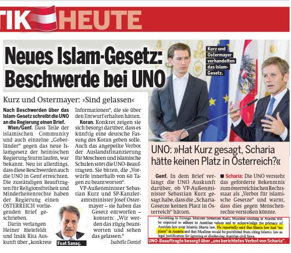 Die Tageszeitung „Österreich“ berichtet in ihrer Online-Ausgabe vom 5.11.2014 über einen Brief seitens der zuständigen Beauftragten für Religionsfreiheit und Minderheitenrechte der UNO an die österreichische Bundesregierung.