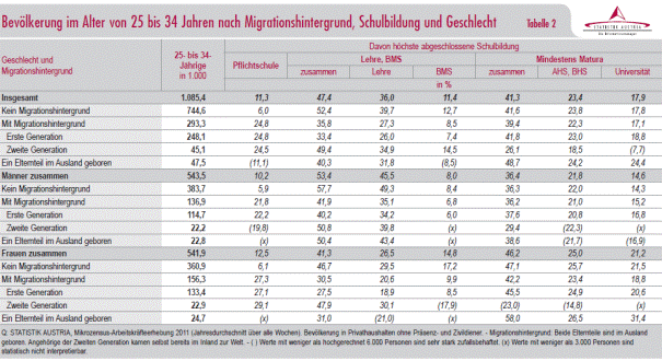 [1] Stadler/ Wiedenhofer-Galik: Bildungs- und Erwerbspartizipation junger Menschen in Österreich unter besonderer Berücksichtigung des Migrationshintergrundes (Statistische Nachrichten 2012)