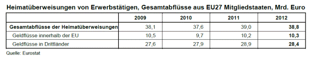 „Davon wurden 402 Millionen in andere EU-Länder und 359 Millionen in Drittländer überwiesen. Dies bedeutet eine Steigerung im Vergleich zum Jahr 2011, als die Summe der Heimatüberweisungen 707 Millionen betrug. Damals wurden 378 Millionen in EU-Länder und 329 Millionen in Drittländer transferiert. Auf umgekehrtem Weg wurde aus Ländern der EU Geld nach Österreich transferiert: Während im Jahr 2011 etwa 536 Millionen Euro nach Österreich flossen wurden 2012 etwa 573 Millionen Euro transferiert, ein Anstieg von etwa 37 Millionen. Die meisten Einnahmen an Remittances in Österreich stammen aus Deutschland. (Migration und Wirtschaft; Factsheet 04; Österreichischer Integrationsfonds)