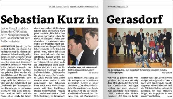 Der Bundesminister für Europa, Integration und Äußeres Sebastian Kurz wird in der Ausgabe 2/2015 der „Bezirksblätter“, Lokalausgabe Mistelbach wie folgt zitiert: