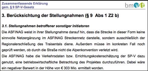 In der Vergangenheit hat die ASFINAG selbst dargestellt, dass die S 34 als Netzerweiterung für die ASFINAG - immerhin eine Aktiengesellschaft - nicht sinnvoll ist. So heißt es in der ASFINAG-Stellungnahme in der Strategischen Prüfung Verkehr, die in der „Zusammenfassenden Erklärung zur SP-V gemäß § 9 SP-V-Gesetz“ durch das BMVIT von Februar 2006 auf Seite 10 wiedergegeben ist, wörtlich: