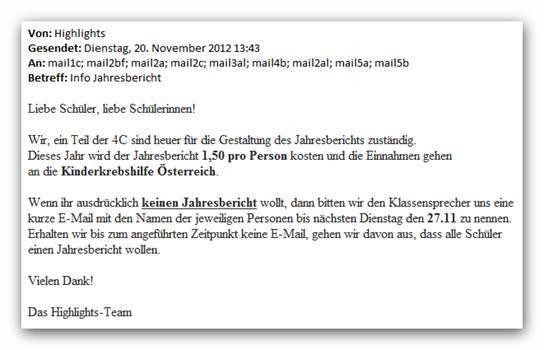 An der HLW Biedermannsdorf/NÖ wurde seit mehreren Jahren im Rahmen des Unterrichts ein Jahresbericht – genannt „Highlights“ – erstellt. Der Jahresbericht wurde zunächst kostenlos an die SchülerInnen verteilt; dies war möglich, weil der Elternverein sich bereit erklärt hatte, jene Kosten zu übernehmen, die nicht durch Werbeinserate abgedeckt werden konnten. Gemeinsam mit den SchülerInnen, die für den Jahresbericht verantwortlich waren, wurde vereinbart, dass ab dem Schuljahr 2011/12 jede/r SchülerIn und jede/r LehrerIn für einen Jahresbericht € 1,50, später € 2,00, bezahlen sollte. Nachdem von der HLW Biedermannsdorf aber bereits jährlich ein Qualitätssicherungsbeitrag von den SchülerInnen eingehoben wird, war auch Teil der Vereinbarung, dass die so erzielten Einnahmen nicht der Schulverwaltung, sondern der Kinderkrebshilfe zukommen sollten (siehe Anlage).