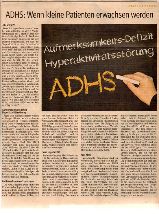 Im Jahr 2013 und im Jahr 2014 wurden im „Standard“ bezahlte Anzeigen für ADHS geschalten (siehe Scan) mit einem Kostenpunkt von ca. 11.000 Euro pro Inserat.