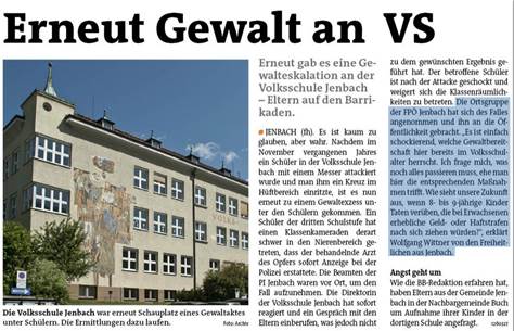 Nach dem Zwischenfall vom November des Vorjahres in der Volksschule Jenbach (Tirol), bei dem einem Schüler mit einem Messer ein Kreuz in den Rücken geritzt wurde, hat sich am 25.02.2015 erneut eine Körperverletzung an der Volksschule zugetragen. Ein Schüler der dritten Unterrichtsstufe wird schon seit geraumer Zeit auf Grund seiner Beeinträchtigung von einem Mitschüler mit Migrationshintergrund regelrecht gemobbt, beleidigt und beschimpft, wie das Bezirksblatt berichtete (http://www.meinbezirk.at/fuegen/chronik/erneut-gewalt-an-jenbacher-volksschule-d1260327.html). Am 25.02.2015 folgte den bisher verbalen Attacken ein tätlicher Angriff mit dem Ergebnis einer erheblichen Körperverletzung im Nierenbereich.
