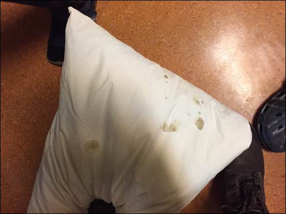 Vollkommen verschmutzes Bettzeug mit Spuren von Blut und Erbrochenem |