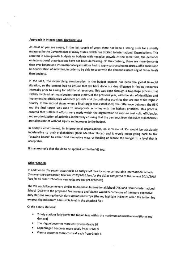 Die VIS hat gleichzeitig ihre Schulgebühren empfindlich erhöht bzw. wird diese erhöhen. Das hat inzwischen auch Unruhe bei betroffenen Eltern ausgelöst. Uns liegt ein Schreiben von Eltern aus der Internationalen Atomenergie-Organisation vor, in dem diese die Erhöhung der Schulgelder kritisch kommentieren: „In addition, neither the American International School (AIS) or the Danube International School (DIS) are subsidised by the Austrian Government, so it brings in question why would the school fees go up so drastically and to similar levels of AIS or the DIS if the VIS still continues to receive a subsidy of €4.0 million.“ (siehe Beilage!)