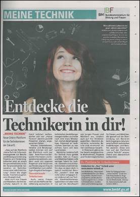 In der Tageszeitung „Österreich“ vom 27. April 2015 ist auf Seite 55 ein Inserat des BMBF mit dem Titel „Meine Technik – Entdecke die Technikerin in dir!“ zu finden.