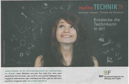 In der Tageszeitung „Heute“ vom 18. Mai 2015 ist auf Seite 5 ein Inserat des BMBF mit dem Titel „Entdecke die Technikerin in dir!“ zu finden.