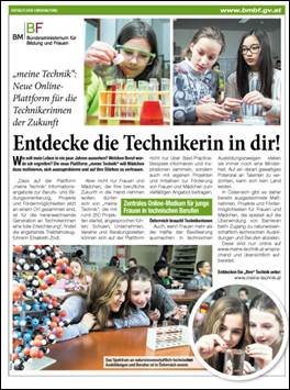 In der Tageszeitung „Heute“ vom 28. Mai 2015 ist auf Seite 21 ein Inserat des BMBF mit dem Titel „Entdecke die Technikerin in dir!“ zu finden.