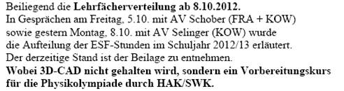 Die Anfragebeantwortungen zur Anfrage 13149-J/XXIV. GP und den Folgeanfragen 14707-J/XXIV. GP, 14716-J/XXIV. GP stehen im krassen Widerspruch zu den der FPÖ vorliegenden Informationen. So schrieb etwa der Vorsitzende der Personalvertretung der HTL Eisenstadt am Dienstag, 9. 10. 2012: