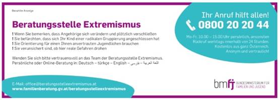In der Tageszeitung „Österreich“ vom 21. Juli 2015 ist auf Seite 11 ein Inserat des BMFJ mit dem Titel „Beratungsstelle Extremismus“ zu finden.
