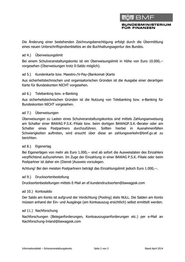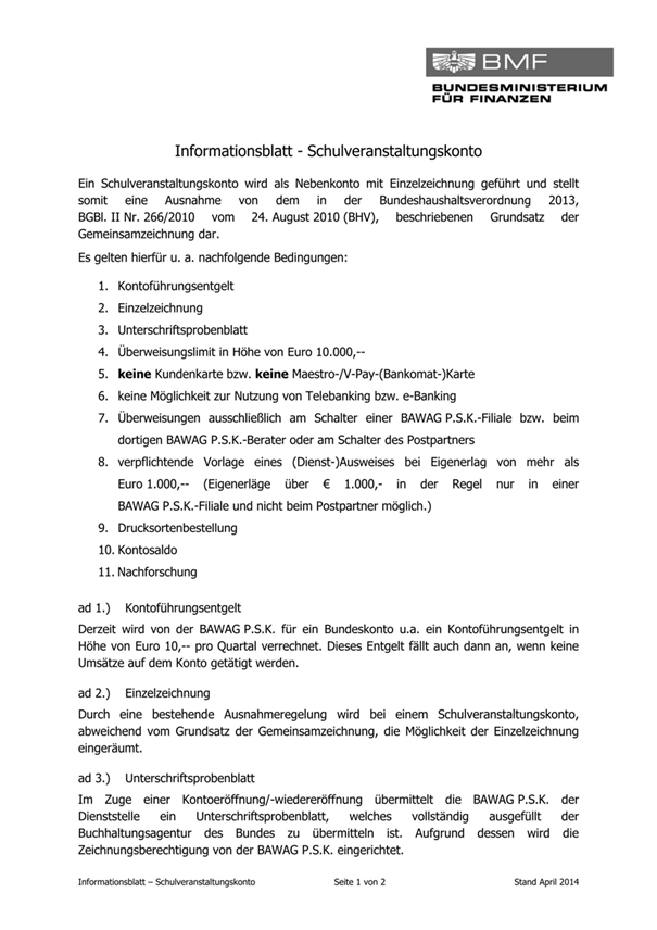 Pro Schulveranstaltung (z.B. Schikurs) wurde ein Subkonto des Kontos der Schule eingerichtet. Die Kontoauszüge konnten jederzeit zur Kontrolle ausdruckt werden. Überweisungen (z.B. an Quartiergeber) konnten mittels Telebanking/OnlineBanking etc. erfolgen. Nach der Schulveranstaltung wurde mit Belegen und Rechnungen abgerechnet und das Konto wieder auf null gestellt. Für die Schule fielen keine zusätzlichen Kosten an. Alle Belege und Abrechnungen wurden an den zuständigen Landesschulrat geschickt.