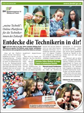 In der Gratiszeitung „Heute“ vom 13. Oktober 2015 ist auf Seite 8 ein Inserat des BMBF mit dem Titel „Entdecke die Technikerin in dir!“ zu finden.