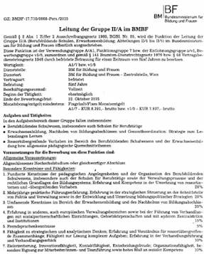Wie im Amtsblatt zur „Wiener Zeitung“ vom 22. September 2015 zu sehen ist, planen Sie anscheinend eine größere Umbildung in Ihrem Ressort, da darin insgesamt 16 Stellen im Bereich des BMBF ausgeschrieben sind. Eine der ausgeschriebenen Stellen betrifft die „Leitung der Gruppe II/A im BMBF (Berufsbildende Schulen, Erwachsenenbildung; Abteilungen II/1 bis II/5)“: