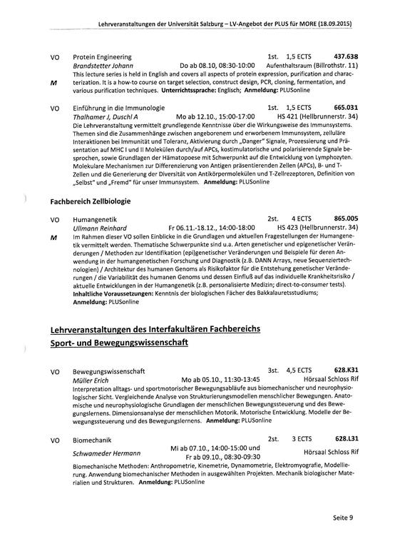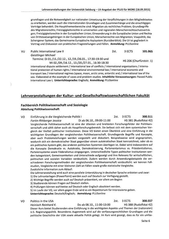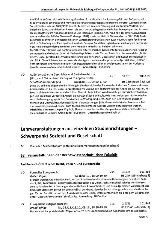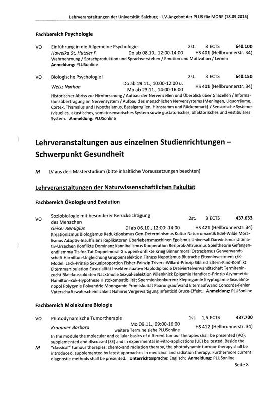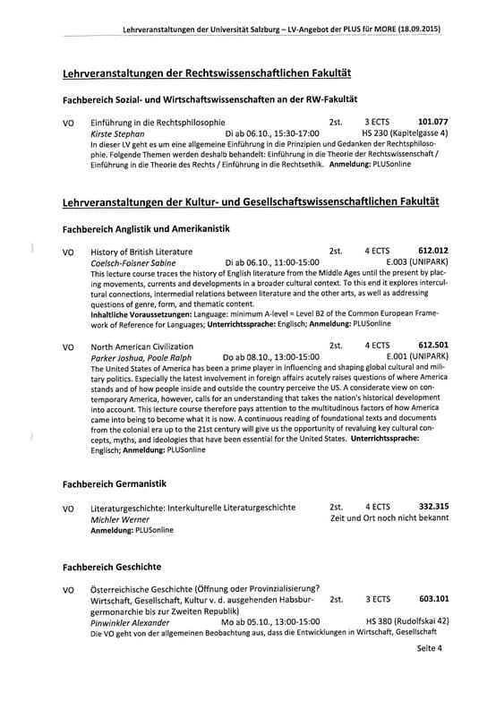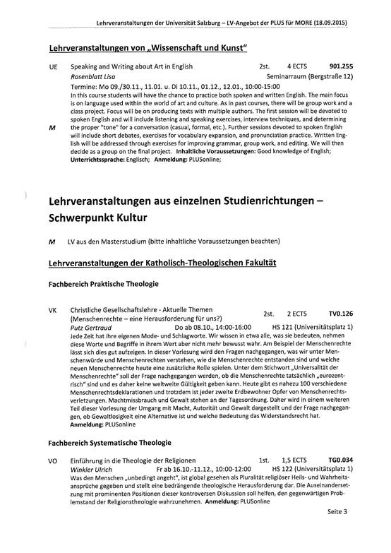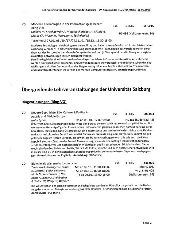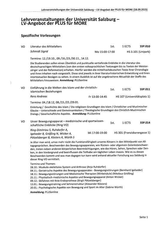 Zu den im Rahmen des MORE-Programms an der Paris-Lodron-Universität Salzburg angebotenen Lehrveranstaltungen gehören (auszugsweise, für die vollständige Liste vgl. den Anhang) die folgenden: