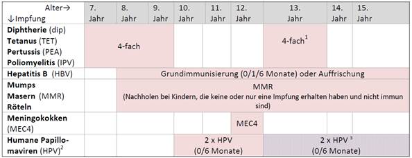 Abb.: Impfkalender des Gratiskinderimpfprogrammes für Schulkinder (https://www.sozialversicherung.at/portal27/portal/esvportal/content/contentWindow?contentid=10008.557136&action=b&cacheability=PAGE&version=1421659354, Stand: 30.11.2015)