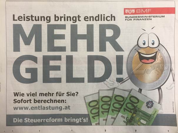 In einer Vielzahl von Werbeeinschaltungen wie TV-Spots, Zeitungsinseraten, etc. wurde die Steuerreform durch das Finanzministerium beworben. Beispielsweise war folgende Einschaltung mehrfach in österreichischen Tageszeitungen zu finden: