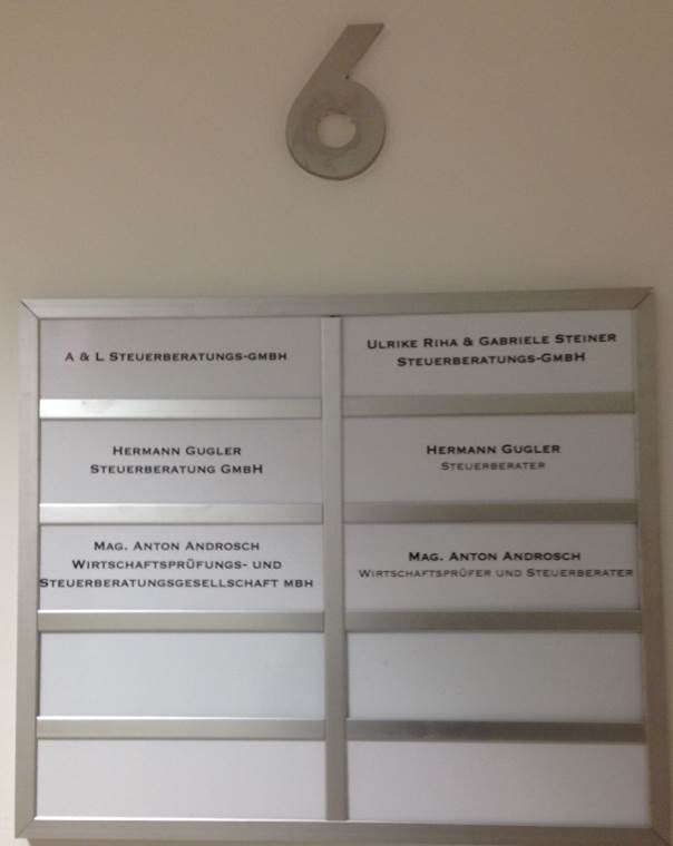 Dort findet sich Hermann Gugler, Steuerberater und die Hermann Gugler Steuerberatungs GmbH. Neben der Hermann Gugler Steuerberatungs GmbH sind dort an der gleichen Adresse noch die A&L Steuerberatungs GmbH, die die Mag. Anton Androsch Wirtschaftstreuhänder und Steuerberatungs GmbH sowie die die Ulrike Riha&Gabriele Steiner Steuerberatungs OHG tätig.