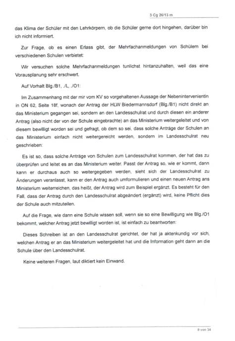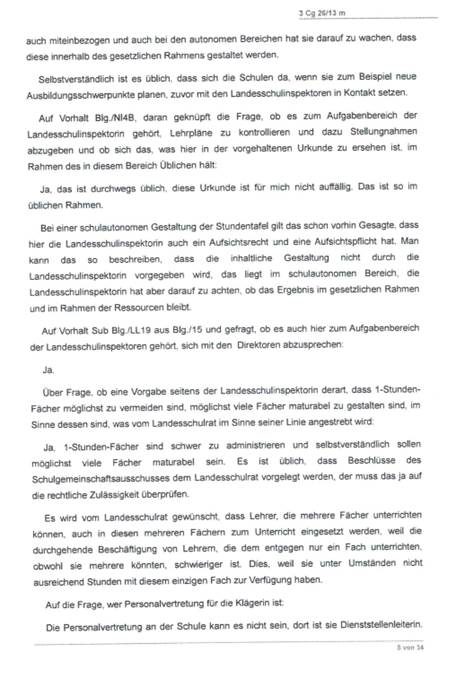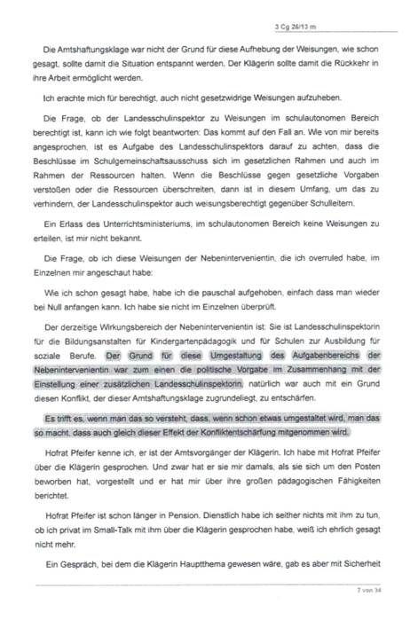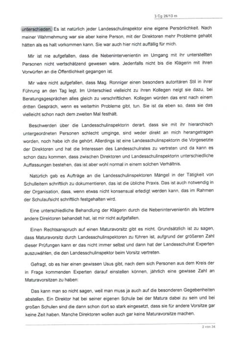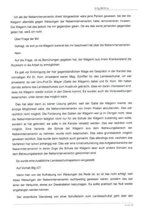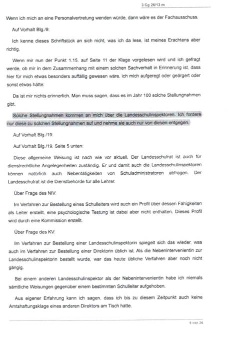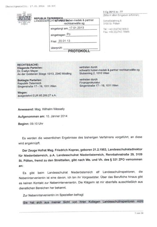 Der Ehegatte von Frau Dr. Mayer erhob in er zitieren ORF-Sendung den schwerwiegenden Vorwurf, Herr Mag. Koprax habe im Amtshaftungsverfahren seiner Frau vor dem Landesgericht St. Pölten als Zeuge falsch ausgesagt. Er habe geleugnet, dass Frau Mag. Ronniger die Schulaufsicht entzogen worden sei und behauptet, der Grund für die Umgestaltung des Aufgabenbereiches sei eine politische Vorgabe zur Bestellung einer zusätzlichen Landesschulinspektorin gewesen. Uns wurde das Protokoll über die Zeugeneinvernahme von Herrn Mag. Koprax zur Verfügung gestellt. Wir schließen es unserer Anfrage an. Daraus folgt eindeutig, dass Herr Mag. Koprax vor Gericht unter Wahrheitspflicht die Unwahrheit gesagt hat. Als oberster Beamter des Landesschulrats für Niederösterreich muss ihm das auch bewusst gewesen sein. Herr Mag. Koprax hat offenbar versucht, Frau Mag. Ronniger zu schützen und deshalb die Unwahrheit gesagt.
