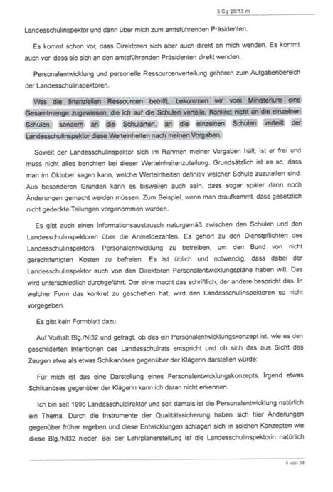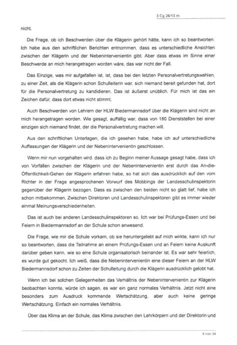 Im ORF hat in seiner Sendung „Bürgeranwalt“ am 30.01 2016 im Beitrag „Gemobbte Direktorin“ Vorfälle abgehandelt, die die Grünen seit mehr als vier Jahren thematisieren. Nunmehr steht fest, dass Landesschulinspektorin Mag. Ronniger durch jahrelanges vorsätzliches Mobbing eine dauernde Dienstunfähigkeit der Direktorin der HLW Biedermannsdorf, Frau Dr. Evelyn Mayer, verursacht hat. Das Urteil des OGH (24.11.2015, 1 Ob 106/15t) spricht eine deutliche Sprache. Frau Dr. Mayer wurde demnach systematisch und gezielt schikaniert. Der Bund wird die erfolgreiche Klägerin für den erlittenen Schaden schadlos zu halten haben. Die genaue Schadenshöhe steht noch nicht fest, wird aber einige hunderttausend Euro betragen.