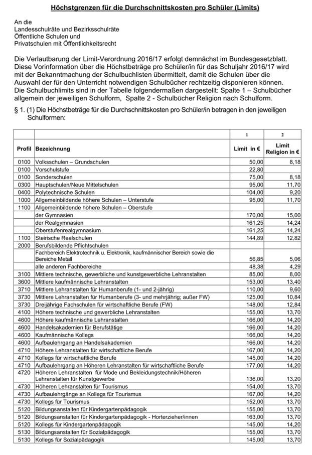 [4] Höchstgrenzen für die Durchschnittskosten pro Schüler (Limits), Vorabinformation des BMFJ für das Schuljahr 2016/17, siehe Anhang