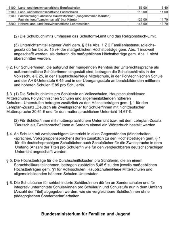 Die jährlich erstellte Limit-Verordnung des Bundesministeriums für Familie und Jugend regelt, bis zu welchen Höchstgrenzen Schulbücher für SchülerInnen je nach Schulform angeschafft werden dürfen. Auch auf besondere Bedürfnisse spezieller SchülerInnengruppen wird in der Verordnung Rücksicht genommen. So gibt es beispielsweise für SchülerInnen mit Förderbedarf in Deutsch, mit Sehbehinderungen oder sonderpädagogischem Förderbedarf zusätzliche Mittel.