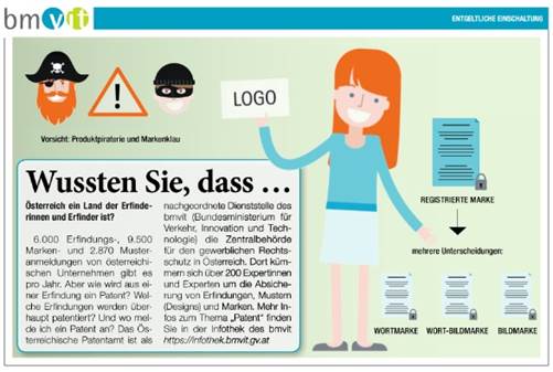 In der Gratiszeitung „Heute“ vom 18. Feber 2016 ist auf Seite 11 ein Inserat des BMVIT mit dem Titel „Wussten Sie, dass… Produktpiraterie“ zu finden.