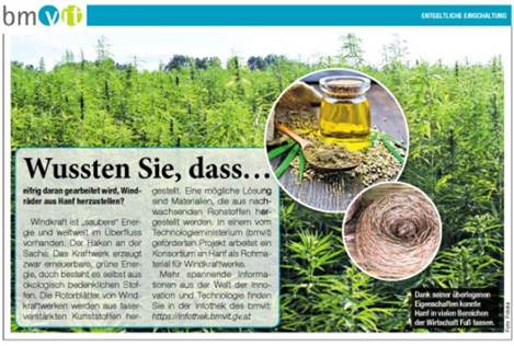 In der Gratiszeitung „Heute“ vom 23. Feber 2016 ist auf Seite 12 ein Inserat des BMVIT mit dem Titel „Wussten Sie, dass… Windräder aus Hanf“ zu finden.