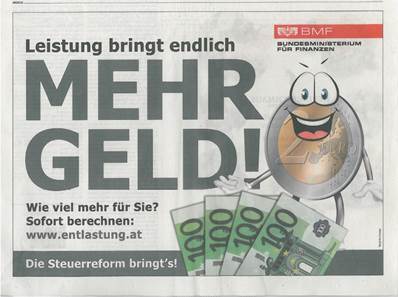 In der Wochenzeitung „Die Zeit“ vom 4. Februar 2016 ist auf Seite 9 ein Inserat des BMF mit dem Titel „Mehr Geld“ zu finden.