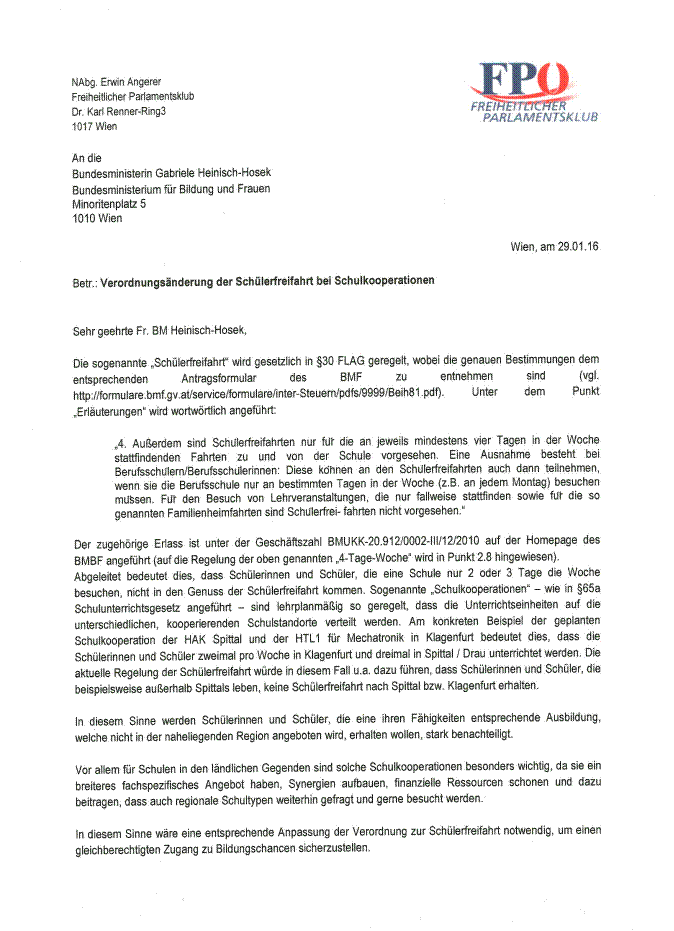 NAbg. Erwin Angerer hat in diesem Zusammenhang bereits am 29.01.2016 an die Bundesministerin Gabriele Heinisch-Hosek einen Brief übermittelt und gebeten, für die betroffenen Schülerinnen und Schüler eine Lösung herbeizuführen.
