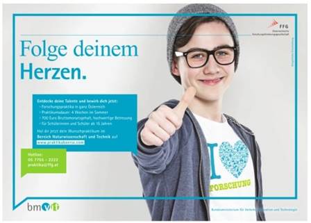 In der Gratiszeitung „Österreich“ vom 13. April 2016 ist auf Seite 9 ein Inserat des BMVIT mit dem Titel „Folge deinem Herzen“ zu finden.