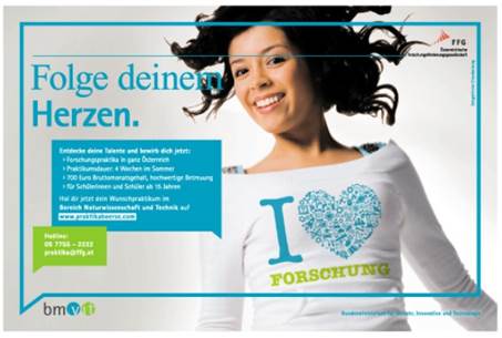 In der Gratiszeitung „Heute“ vom 12. April 2016 ist auf Seite 6 ein Inserat des BMVIT mit dem Titel „Folge deinem Herzen“ zu finden.