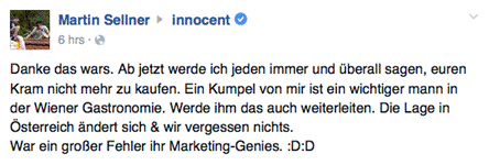 Nachdem der Smoothie-Hersteller „Innocent“ eine auf den Bundespräsidentschaftswahlkampf anspielende Kampagne lanciert und in einer Kommentierung zu einem Posting geschrieben hatte „Unsere Flaschen enthalten garantiert kein braunes Fallobst. Versprochen"[3], sah sich Martin Sellner, Obmann der Wiener Identitären (einst Aktivist im Dunstkreis des Holocaustleugners Gottfried Küssel und mutmaßlicher Administrator der mittlerweile verbotenen Website alpen-donau.info) am 13.4.2016 animiert, eine mehr oder weniger unverhohlene Drohung auf der Facebook-Seite von „Innocent“ zu hinterlassen: „Die Lage in Österreich ändert sich & wir vergessen nichts.“