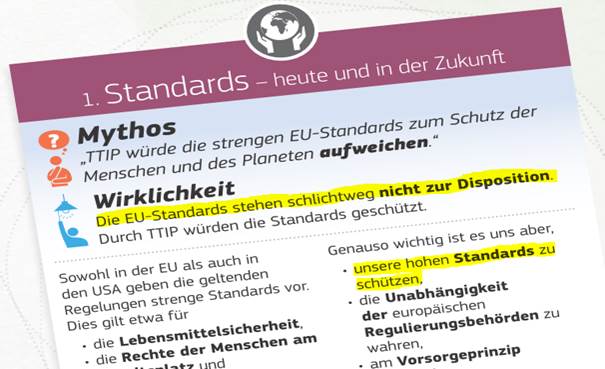 Eine Broschüre der Europäischen Kommission will über „10 Mythen über TTIP“ aufklären. Diese 20-seitige Broschüre wurde bzw. wird an SchülerInnen der AHS-Oberstufe verteilt. Die Inhalte der Broschüre sind klar einseitig pro-TTIP gehalten und zum Teil sogar in sich widersprüchlich. Schon auf Seite 4 der Broschüre findet sich zum Mythos betreffend europäische Standards folgender Eintrag: