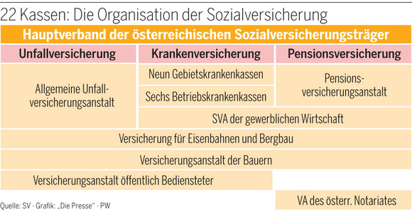Im Schussfeld stand nicht nur die Allgemeine Unfallversicherungsanstalt, sondern speziell die Wiener Gebietskrankenkasse wegen ihrer roten Zahlen. Landespolitikern, etwa in Oberösterreich, stößt sauer auf, dass ihre Kasse über einen eigenen Topf die chronische defizitäre Wiener Kasse (WGKK) durchfüttern muss. Von einem Dschungel an unterschiedlich hohen Leistungen und Selbstbehalten für Versicherte je nach Kasse trotz bundesweit einheitlicher Beiträge ganz abgesehen. Dabei wird auch dieses Faktum seit Langem kritisiert.
