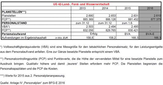 „Der veranschlagte Personalaufwand 2016 geht gegenüber dem Voranschlag 2015 um 2,0 Mio. EUR (-1,2 %) zurück, gegenüber dem tatsächlichen Wert von 2014 steigt er um 8,1 Mio. EUR (+5,1 %) an. Gegenüber 2015 ist die Senkung im Jahr 2016 insbesondere auf geringere Dotierungen von Jubiläums- und Abfertigungsrückstellungen zurückzuführen. Der Anstieg gegenüber dem tatsächlichen Aufwand 2014 beruht im Wesentlichen auf höheren Bezügen. Diese Entwicklung verläuft entgegengesetzt zum vorgesehen Rückgang der Planstellen.“[2]