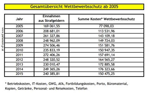 · Laut der von Ihnen übermittelten Unterlagen wurden jedoch 2015 „Strafgelder“ in der Höhe von 240.385,10 Euro im Jahr 2015 von der Wirtschaftskammer im Bereich Wettbewerbsschutz „eingenommen“.