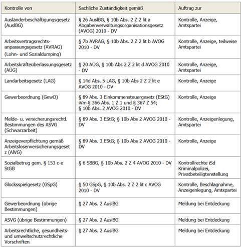· Laut Anfragebeantwortung von Minister Schelling vom 2. Mai 2016 ist die Finanzpolizei für Kontrollen, welche die Schwarzarbeit bzw. unerlaubte Gewerbeausübung betreffen, verantwortlich.