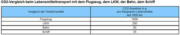 Täglich werden tausende Tonnen Lebensmittel aus Übersee nach Europa gebracht. Wie aus den Tabellen ablesbar, sind für die Umwelt die Flugtransporte am bedenklichsten. Ware aus Übersee wird größtenteils zwar mit dem Schiff transportiert, wo der geringste CO2-Ausstoß pro Kilometer stattfindet, jedoch sind die Wegstrecken vergleichsweise lang: