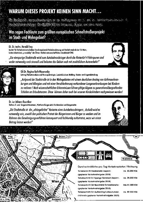 III. Unzureichende bzw. einseitige Informationspolitik zu den Teilprojekten liegen von den Projektbetreibern vor. So wird auf die "Entlastung von Ortskernen" hingewiesen, nicht jedoch auf den zu erwartenden Anstieg des MIV durch den Ausbau eben dieser genannten Hochleistungsstraßen. Weiters findet sich kein Hinweis auf den zu erwartenden Transitverkehr durch bestehende und zukünftige Wohngebiete durch die an die S1 angeschlossene Hochleistungsstraße S8 aus Bratislava, die in Richtung Polen und Ukraine hochwertig angebunden ist (siehe links unter e/V/iv/1-3).